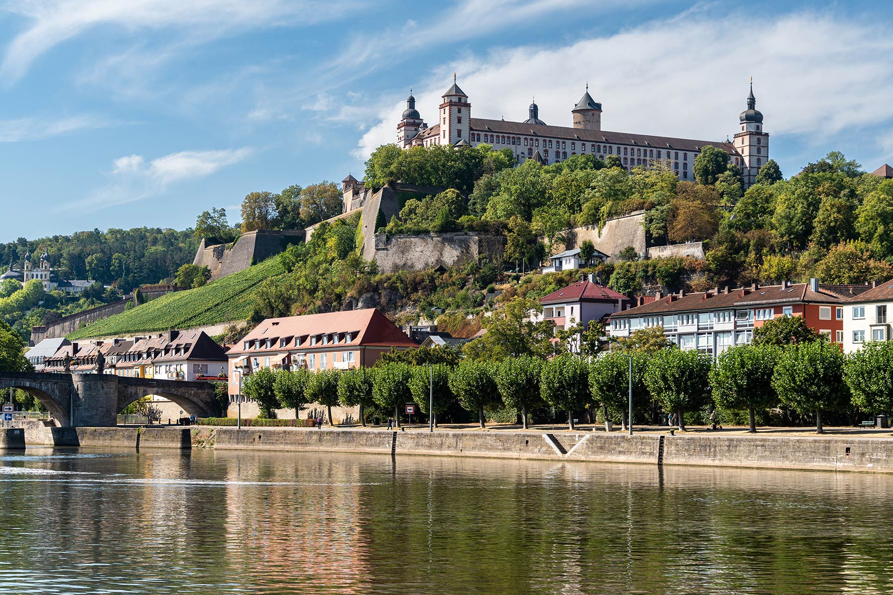 Je näher man Würzburg kommt, desto beeindruckender wird die Kulisse: Über der Stadt thront die Festung Marienberg, während die Türme der Kirchen und die Alte Mainbrücke das Panorama prägen. Ziel der Tour ist die berühmte Würzburger Residenz – UNESCO-Weltkulturerbe und ein Meisterwerk des Barock.