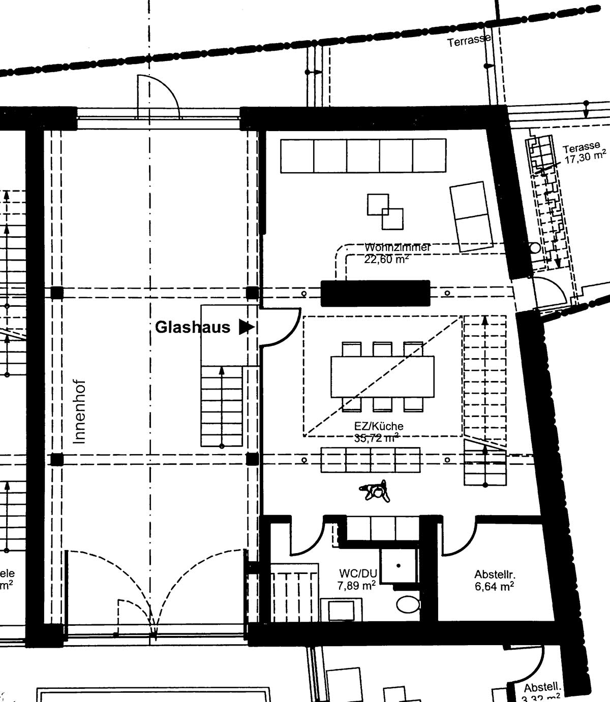 Mit ca. 120 qm, beeindruckender Raumhöhe und einer Architektur, die sofort ins Auge fällt, ist das Glashaus ein ganz besonderer Ort auf dem Hof. Entstanden in der ehemaligen Scheune, verbindet es offenen Loftcharakter mit gemütlicher Wohnlichkeit – großzügig, lichtdurchflutet und außergewöhnlicher Atmosphäre.
